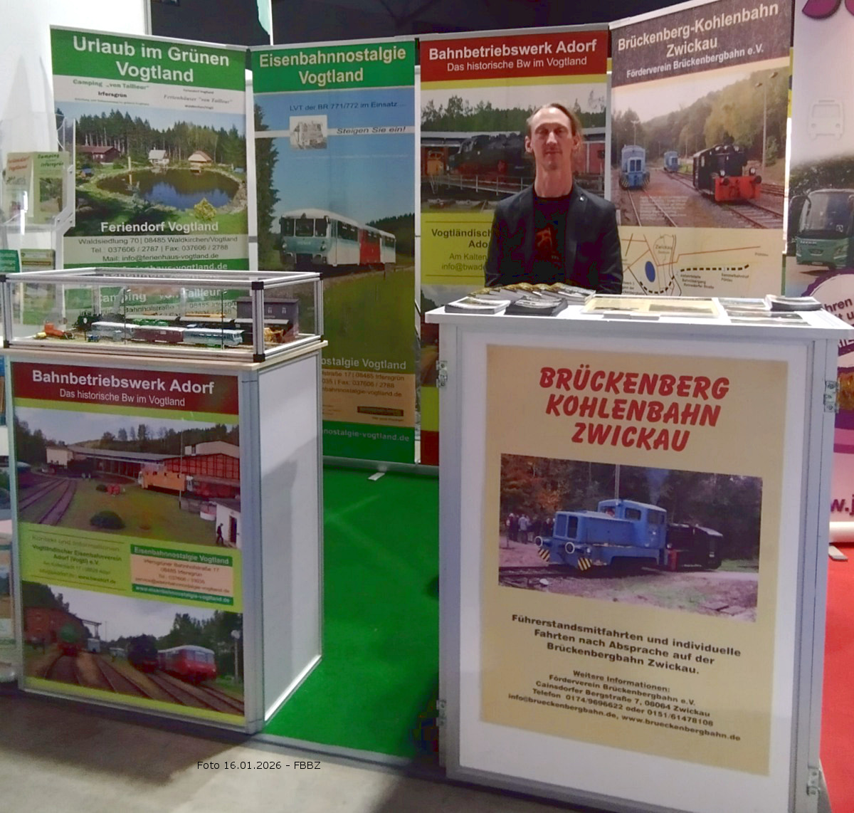 waren wir In der Stadthalle Zwickau, auf dem Stand von "Camping & Ferienhäuser von Tailleur". Es gabt es Flyer und aktuelle Info's zur Eisenbahnnostalgie Vogtland, zum Bw Adorf im Vogtland und zur Brückenberg-Kohlenbahn Zwickau